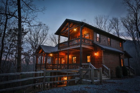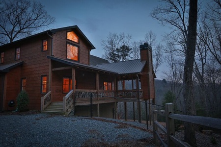 Golden Oaks at Sugar Creek is a gorgeous custom log home that provides all the luxuries that you have come to expect in a luxurious mountain getaway. This home is privately situated and surrounded by hardwoods and plenty of places to explore and admire. Located in Blue Ridge but only a short drive to Ellijay, the location is perfect to enjoy what both towns have to offer. Upon arrival you will notice the large wrap around porch with mountain laurel railings and the stunning wood burning fireplace. Seating is plentiful and comfortable and the outdoor area allows for easy conversations with friends and/or loved ones and the perfect place to watch for the abundant wildlife that call this area home.